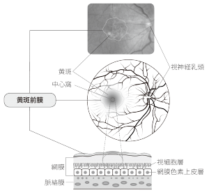 黄斑前膜は、目の中でカメラのフィルムのような役割を担う「網膜」の中心部分にあたる「黄斑部」の前面にうすい膜(前膜)が張る病気です。また、黄斑上膜やセロファン黄斑症とも呼ばれています。